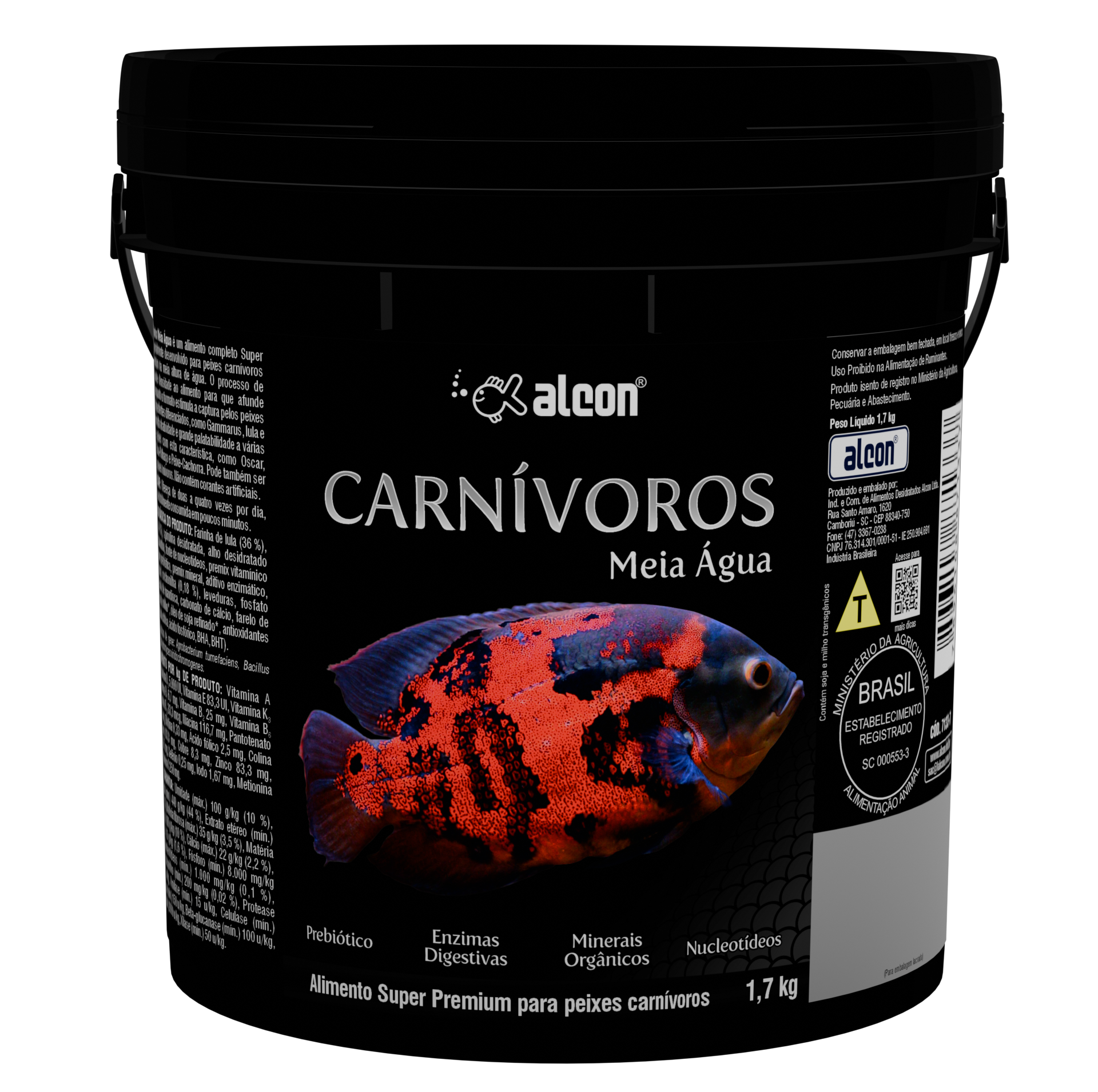 Alcon Carnívoros Meia Água é um alimento completo Super Premium especialmente desenvolvido para peixes carnívoros que se alimentam na meia altura de água. O processo de extrusão garante densidade ao alimento para que afunde lentamente, enquanto o formato estimula a captura pelos peixes predadores. Ingredientes diferenciados, como Gammarus, lula e alho, garantem alta atratividade e grande palatabilidade a várias espécies de peixes com esta característica, como Oscar, Pangassius, Faca-Palhaço e Peixe-Cachorra. Pode também ser oferecido aos peixes onívoros. Não contém corantes artificiais.