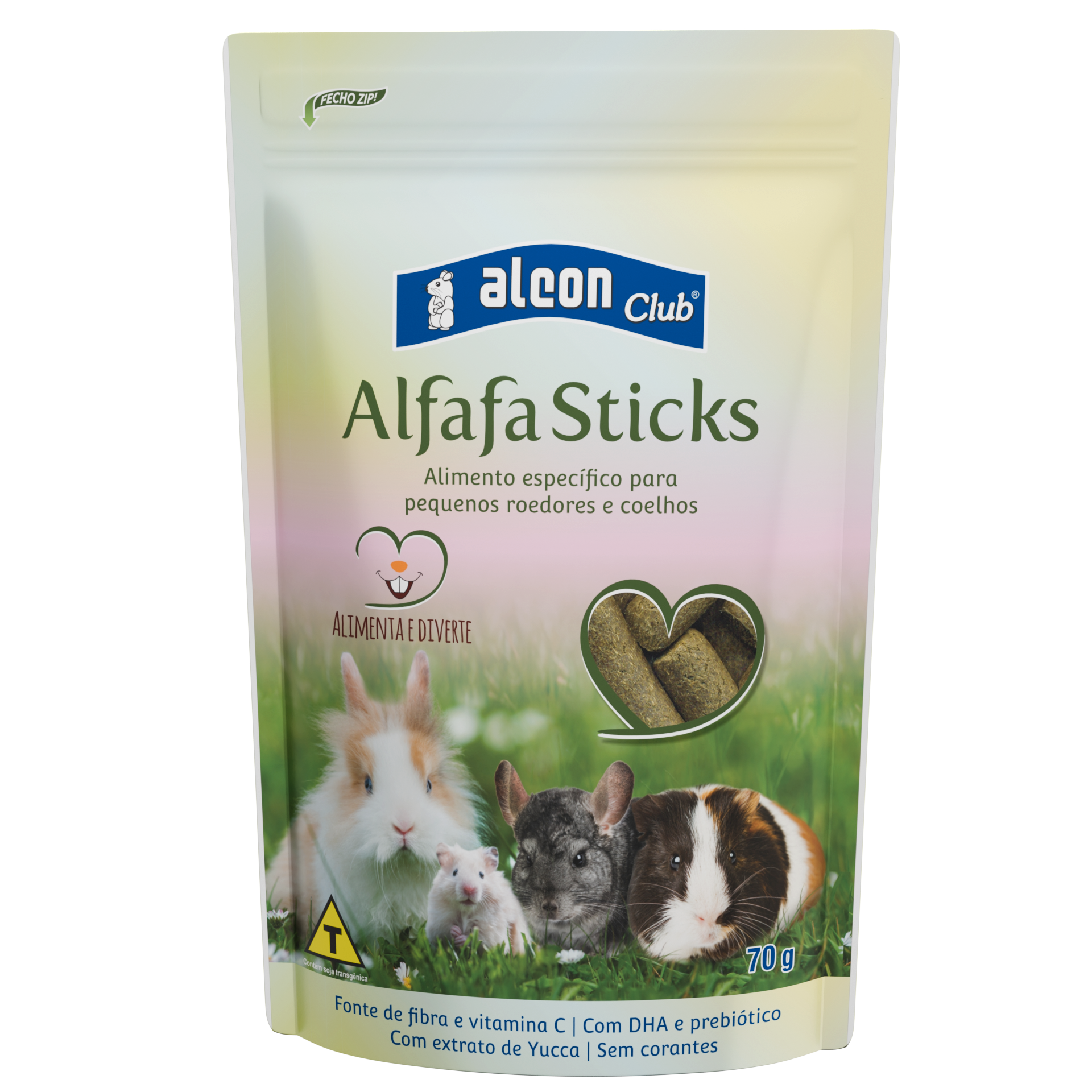 Alcon Club Alfafa Sticks é um alimento extrusado a base de alfafa, muito apreciado pelos pequenos roedores, como Hamster, Topolino, Gerbil, Porquinho da Índia e Chinchila, e também pelos Coelhos de estimação. Excelente fonte de fibra, importante nutriente para esses animais, também é rico em vitamina C e DHA (precursor de Ômega 3), além de prebiótico, que favorece o desenvolvimento da flora intestinal benéfica. Desempenha importante papel no desgaste dos dentes, que têm crescimento constante nesses animais. A presença de extrato de Yucca ajuda a reduzir o odor das fezes. Alimento produzido sem corantes.