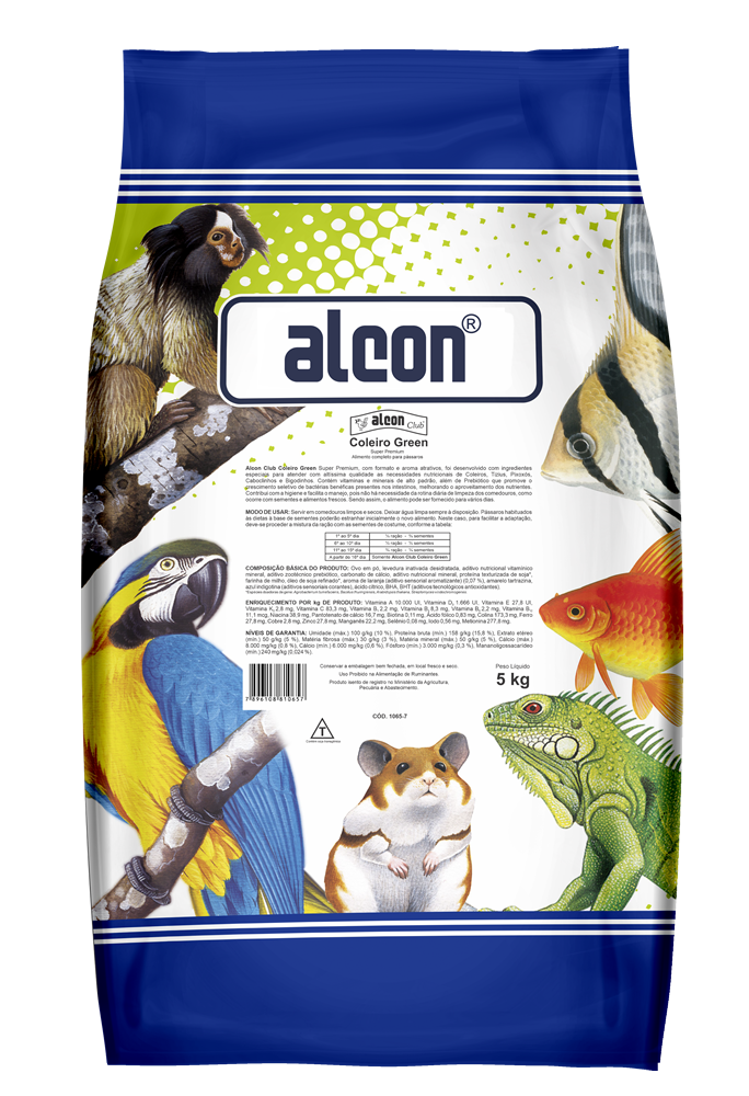Alcon Club Coleiro Green Super Premium, com formato e aroma atrativos, foi desenvolvido com ingredientes especiais para atender com altíssima qualidade as necessidades nutricionais de Coleiros, Tizius, Pixoxós, Caboclinhos e Bigodinhos. Contém vitaminas e minerais de alto padrão, além de Prebiótico que promove o crescimento seletivo de bactérias benéficas presentes nos intestinos, melhorando o aproveitamento dos nutrientes. Contribui com a higiene e facilita o manejo, pois não há necessidade da rotina diária de limpeza dos comedouros, como ocorre com sementes e alimentos frescos. Sendo assim, o alimento pode ser fornecido para vários dias.