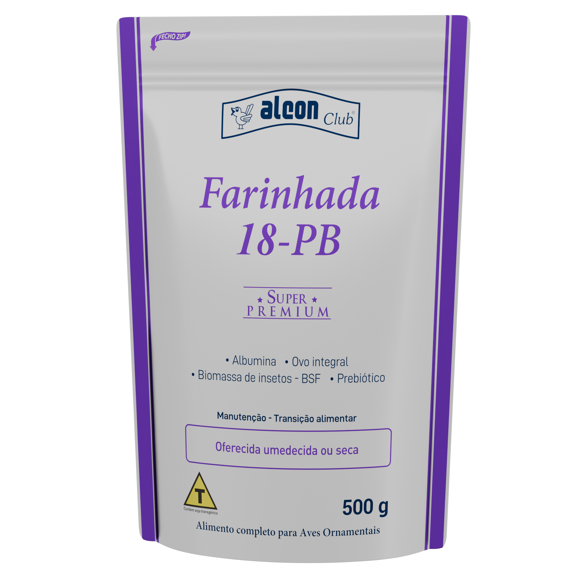 Alcon Club Farinhada 18-PB é um alimento completo Super Premium, cientificamente elaborado para suprir as necessidades nutricionais e energéticas de aves adultas durante a fase de manutenção ou como complemento da dieta em períodos especiais. Suas características particulares de textura, granulometria e maciez são ideais para os períodos de muda de bico e muda de penas. Muito recomendado para realizar transições alimentares em aves que têm dificuldade em aceitar o alimento extrusado. Sua composição criteriosamente balanceada, livre de corantes artificiais e palatabilizantes, possui albumina, ovo integral e biomassa de insetos - BSF (Black Soldier Fly), uma fonte de proteína sustentável de alta biodisponibilidade, rica em ácidos graxos e aminoácidos. Apresenta alta digestibilidade e palatabilidade, além de ser um alimento muito atrativo às aves.