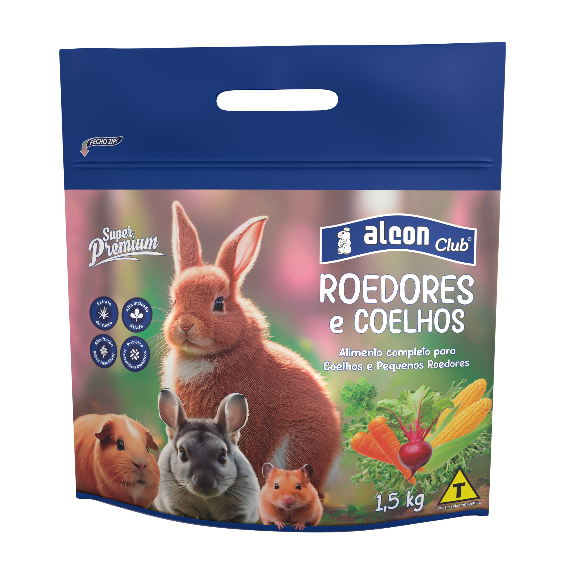 Alcon Club Roedores e Coelhos Super Premium é um alimento completo, cientificamente elaborado para suprir as necessidades nutricionais e energéticas de Mini Coelhos, Coelhos de companhia e pequenos roedores, como Porquinho da Índia, Chinchila, Hamster, Gerbil, e Topolino, durante a fase de manutenção. Sua composição diversificada, livre de corantes, palatabilizantes e aromatizantes, apresenta vegetais como alfafa, cenoura e beterraba, e uma cuidadosa seleção de outros ingredientes que conferem ao alimento excelente palatabilidade e digestibilidade. Além de apresentar alta inclusão de fibra, é enriquecido com vitamina C, nucleotídeos, prebiótico e extrato de Yucca.