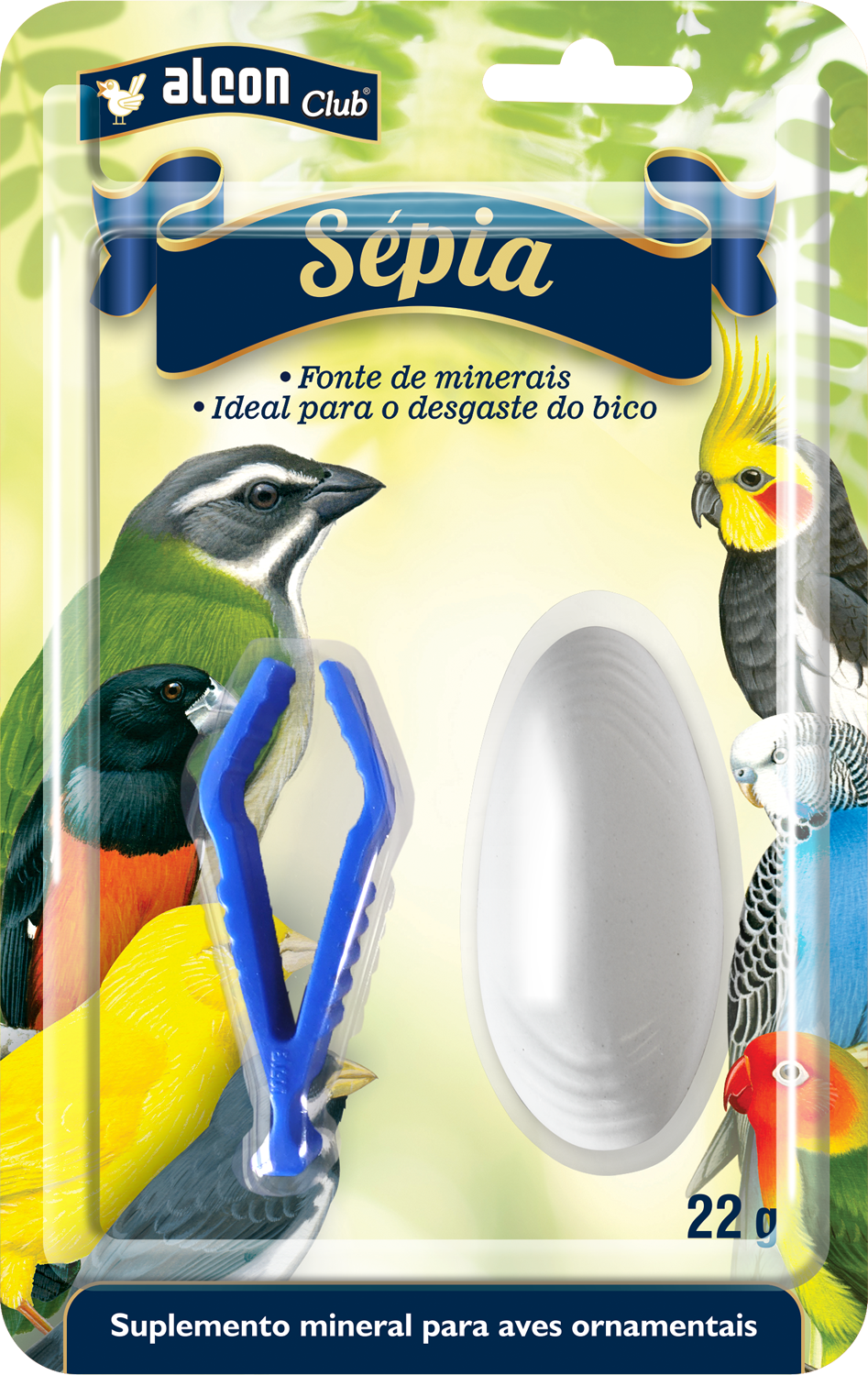Alcon Club Sépia é uma fonte de importantes minerais para as aves mantidas em gaiolas ou viveiros. Fornece, de forma prática, cálcio, fósforo e magnésio, favorecendo o desenvolvimento e fortalecimento de ossos, bico e casca dos ovos. Sua textura proporciona condições ideais para que as aves promovam o necessário desgaste do bico. Promove também distração e entretenimento, evitando que elas danifiquem objetos contidos no recinto.