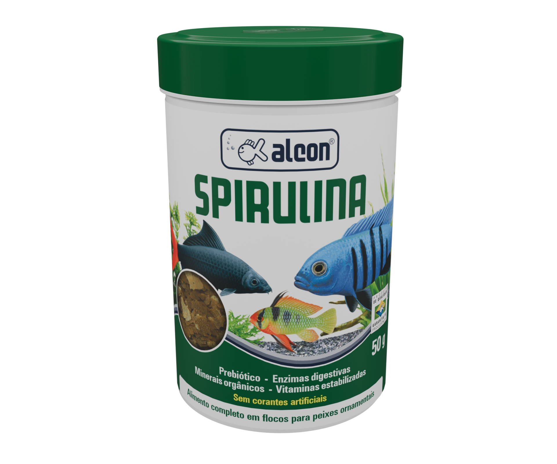 Alcon Spirulina foi elaborado especialmente para peixes ornamentais tropicais e marinhos. Com presença marcante de spirulina, garante elevado teor de proteína e equilíbrio dos demais nutrientes, além de promover o realce da coloração natural dos peixes. Este alimento completo contém ingredientes naturais e altamente selecionados para uma nutrição de qualidade. Para maior biodisponibilidade dos minerais ao organismo dos peixes, possui em sua composição minerais orgânicos quelatados. Também contém Enzimas Digestivas e Prebiótico, que favorecem o desenvolvimento da flora intestinal benéfica, melhorando o aproveitamento dos nutrientes. Não contém corantes artificiais.