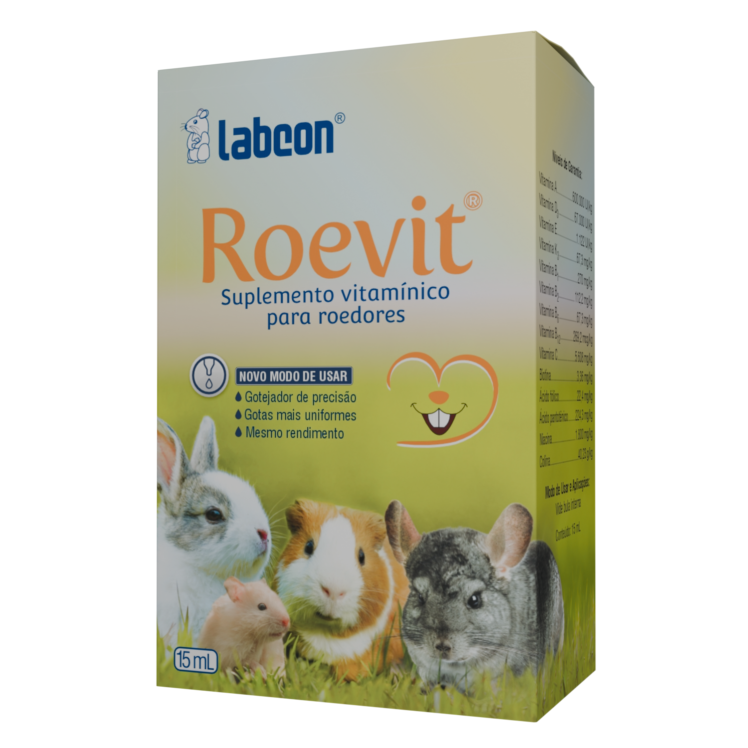 Labcon Roevit é um suplemento de vitaminas adequadamente balanceado para as necessidades dos pequenos roedores, como Hamster, Gerbil (Esquilo da Mongólia), Chinchila e Porquinho da Índia, e também dos Coelhos de Estimação. Especialmente indicado para animais alimentados com sementes, para períodos de reprodução e convalescença. Possui aroma e sabor agradáveis, o que lhe confere grande aceitação.